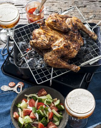 - Rooster de kip op de barbecue om en om bruin en gaar in ca. 40 min., afhankelijk van de grootte en dikte van de kip.