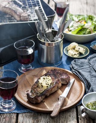 - Bestrooi de entrecotes met zeezout en rooster ca. 21⁄2 min. aan elke kant op de barbecue.