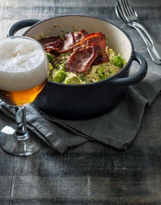 tot deze gesmolten is. Schep als laatste de ui en spruitjes erdoor. Breng op smaak met peper en zout. Serveer met de bacon erop.
