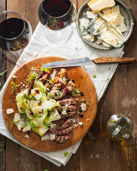 - Bedruppel het vlees met wat balsamicosiroop en verdeel de courgettelinten erover.