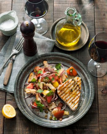 Panzanella met gegrilde witte-tonijnsteaks