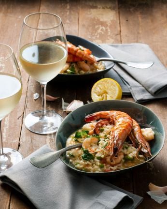 - Voeg dan de rest van de bladpeterselie en de erwtjes toe. Schep voorzichtig om. Schep wat risotto op vier borden en versier met een gegrilde scampi.