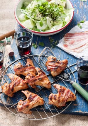 - Neem de plakjes ontbijtspek en wikkel om ieder kippenvleugeltje een plakje spek. Gril om en om ca. 25 minuten.
