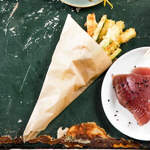 Meng 100 ml sojasaus met 1 fijnge - sneden sjalot, 1 tl verse geraspte gember, 3 el rijstazijn , 1 el vloeiba - re honing en 1 el sesamolie tot een sausje. Snijd 200 g tonijn met een scherp mes in plakjes van een ½ cm dik. Leg de plakjes dakpansgewijs op een schaal, bestrooi ze met 2 tl sesamzaad en leg er 100 g tuinkers op. Serveer de vis met het sausje.