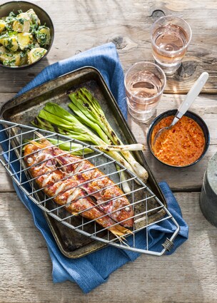 - Lekker met aardappelsalade en gegrilde lente-uitjes.
