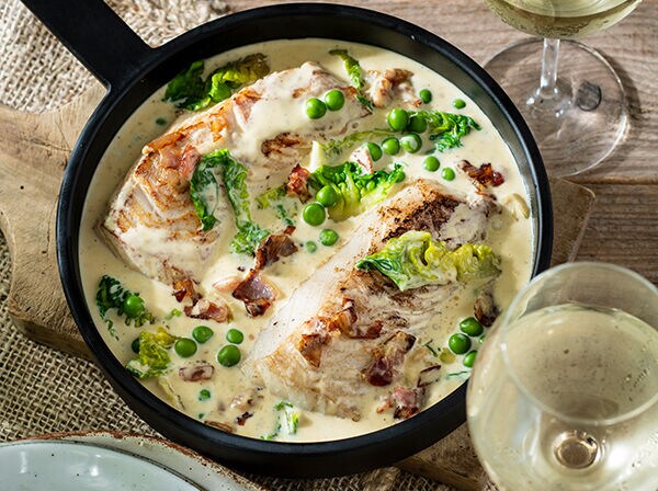- Voeg de erwtjes en de little gem toe en laat nog enkele min. zachtjes koken, zodat de little gem net begint te slinken. De vis moet nu net aan gaar zijn.