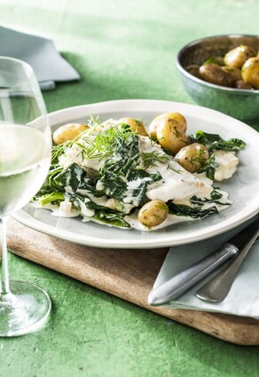 - Verdeel de krielaardappelen, spinazie en venkel over de borden, leg de kabeljauw erop en verdeel de achtergebleven roomsaus erover.