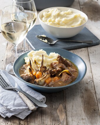 - Let op dat het vlees niet droog komt te staan. Voeg, als het te droog wordt, een beetje bouillon of wijn toe.