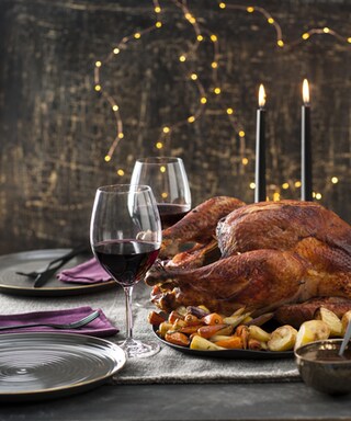- Serveer de kalkoen met de jus, regenboogpeen en aardappels uit de oven.