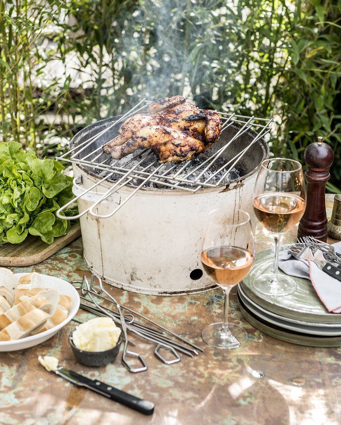 - Leg de kippen opengeklapt met de borst naar beneden op het rooster.