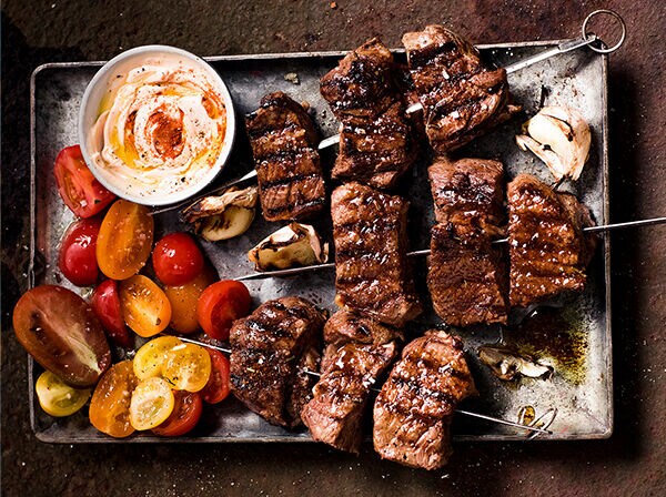 - Snijd de ribeye in stukken van 4x2 cm. Doe ze in een schaal en giet de olijfolie erbij. Strooi de rub erover en meng goed. Rijg het vlees aan vleespennen. Laat de rub 20 minuten intrekken.