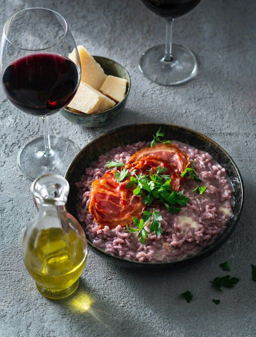 - Voeg de rijst toe en bak enkele min. mee. Blus af met 100 ml rode wijn