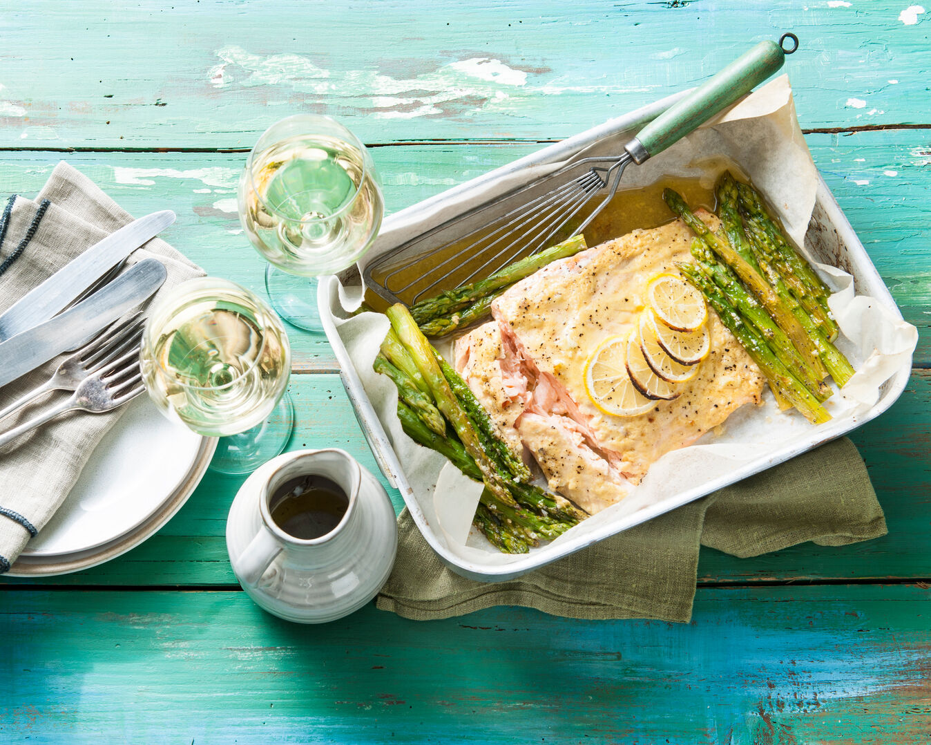 - Meng de rest van de olijfolie met de rest van de knoflook en schenk over de asperges - zorg dat alle asperges met wat olie worden bedekt. Leg de asperges aan twee kanten naast de zalm op de bakplaat.
