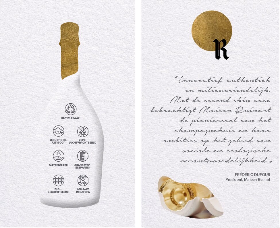 De Ruinart Second Skin Case is het nieuwe duurzame alternatief voor de geschenkverpakking. De 100% papieren verpakking gemaakt van natuurlijk hout uit Europese bossen is volledig recyclebaar en gevormd naar het unieke silhouet van de fles. De kleur en textuur zijn geïnspireerd op de historische Crayerès van het huis, een UNESCO-werelderfgoed. Een innovatieve geschenkverpakking die de contouren van de fles goed doet uitkomen en de integriteit van de smaak garandeert. Met de second skin case bekrachtigt Maison Ruinart, dat haar 4e eeuw van bestaan in gaat, de pioniersrol en haar ambities op het gebied van sociale en ecologische verantwoordelijkheid.