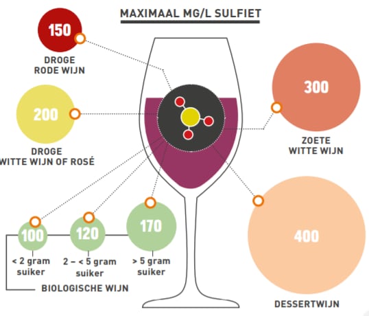 Sinds 2005 is het wettelijk verplicht om ‘bevat sulfieten’ te vermelden op het etiket indien de wijn meer dan 10 mg sulfiet bevat.