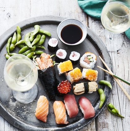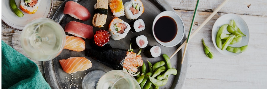 Het zilte van zeewier en vis, samen met de hartige umamismaak van sojasaus vraagt om een opwekkende wijn met een zacht randje.